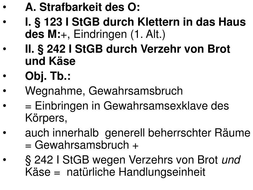A. Strafbarkeit des O: I. § 123 I StGB durch Klettern in das Haus des M:+, Eindringen (1. Alt.) II. § 242 I StGB durch Verzehr von Brot und Käse Obj. Tb.: Wegnahme, Gewahrsamsbruch = Einbringen in Gewahrsamsexklave des Körpers, auch innerhalb generell beherrschter Räume = Gewahrsamsbruch + § 242 I StGB wegen Verzehrs von Brot und Käse = natürliche Handlungseinheit