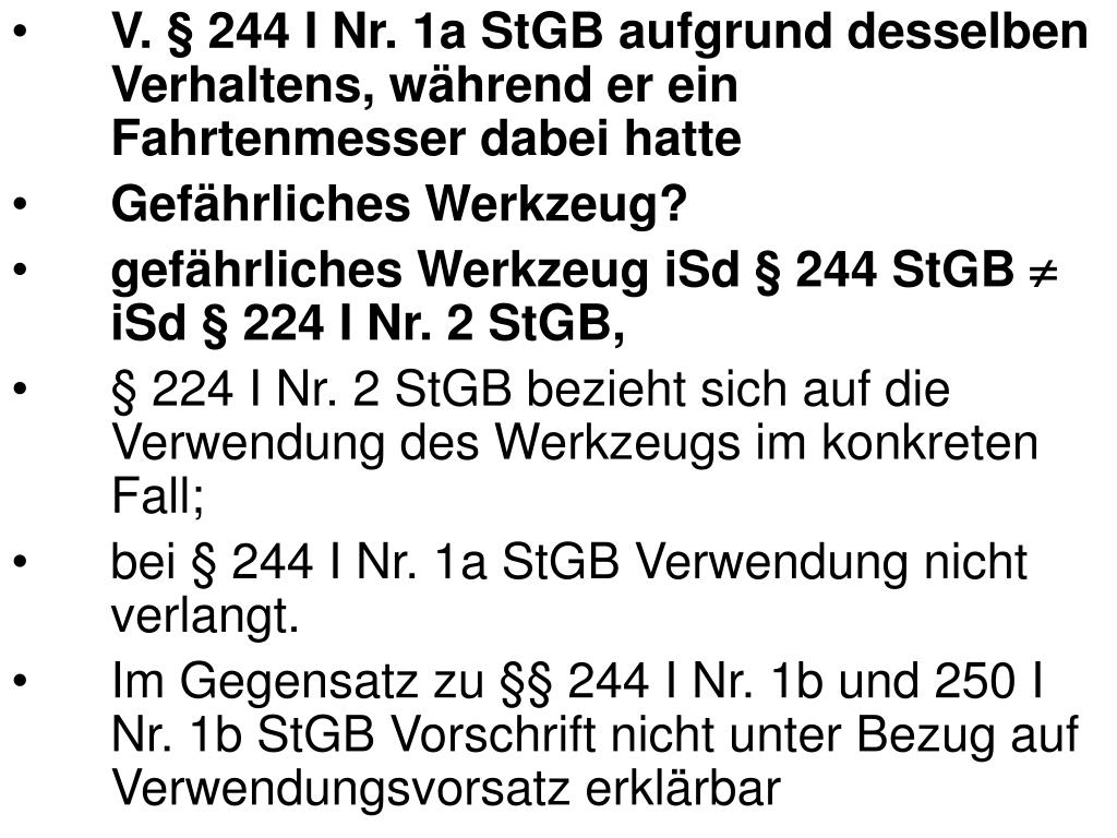 V. § 244 I Nr. 1a StGB aufgrund desselben Verhaltens, während er ein Fahrtenmesser dabei hatte Gefährliches Werkzeug? gefährliches Werkzeug iSd § 244 StGB ¹ iSd § 224 I Nr. 2 StGB, § 224 I Nr. 2 StGB bezieht sich auf die Verwendung des Werkzeugs im konkreten Fall; bei § 244 I Nr. 1a StGB Verwendung nicht verlangt. Im Gegensatz zu §§ 244 I Nr. 1b und 250 I Nr. 1b StGB Vorschrift nicht unter Bezug auf Verwendungsvorsatz erklärbar