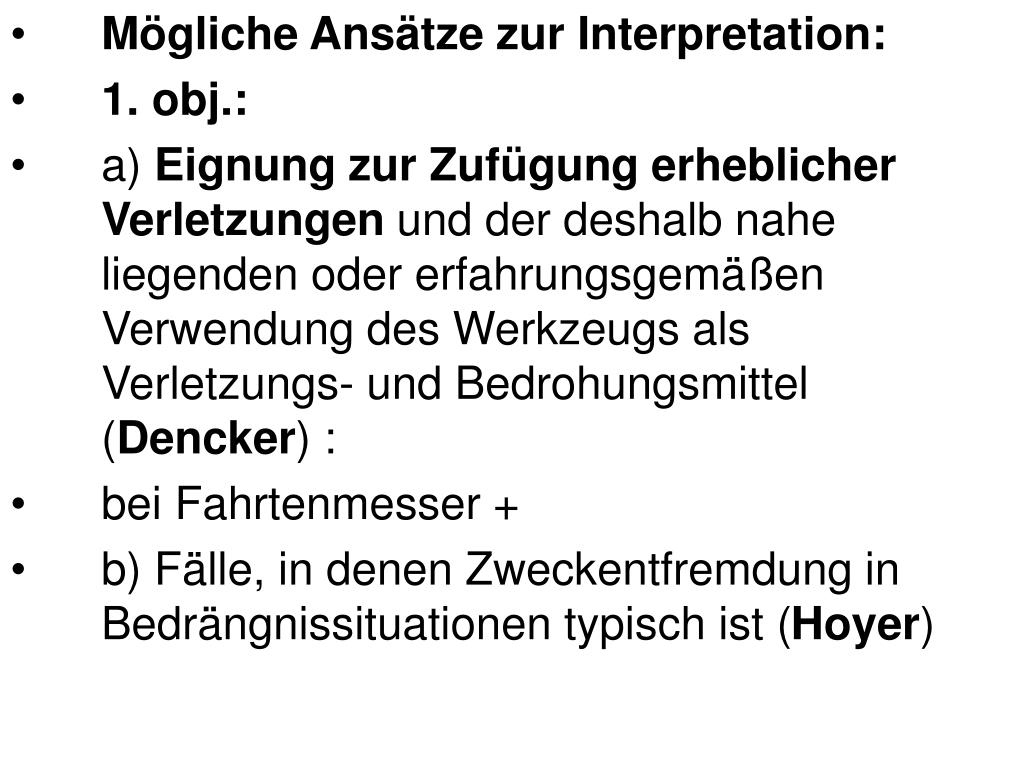 Mögliche Ansätze zur Interpretation: 1. obj.: a) Eignung zur Zufügung erheblicher Verletzungen und der deshalb nahe liegenden oder erfahrungsgemäßen Verwendung des Werkzeugs als Verletzungs- und Bedrohungsmittel (Dencker) : bei Fahrtenmesser + b) Fälle, in denen Zweckentfremdung in Bedrängnissituationen typisch ist (Hoyer)