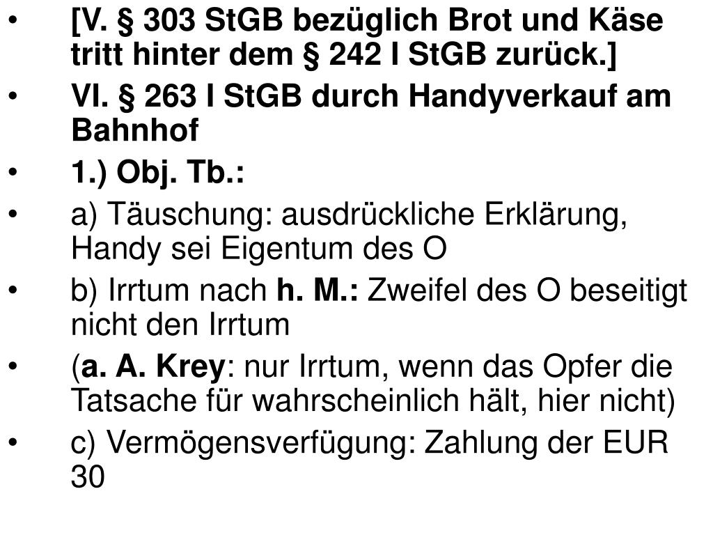 [V. § 303 StGB bezüglich Brot und Käse tritt hinter dem § 242 I StGB zurück.] VI. § 263 I StGB durch Handyverkauf am Bahnhof 1.) Obj. Tb.: a) Täuschung: ausdrückliche Erklärung, Handy sei Eigentum des O b) Irrtum nach h. M.: Zweifel des O beseitigt nicht den Irrtum (a. A. Krey: nur Irrtum, wenn das Opfer die Tatsache für wahrscheinlich hält, hier nicht) c) Vermögensverfügung: Zahlung der EUR 30