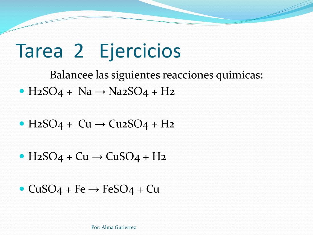 Tarea 2 Ejercicios Balancee las siguientes reacciones quimicas: • H2SO4 + Na → Na2SO4 + H2 • H2SO4 + Cu → Cu2SO4 + H2 • H2SO4 + Cu → CuSO4 + H2 • CuSO4 + Fe → FeSO4 + Cu Por: Alma Gutierrez