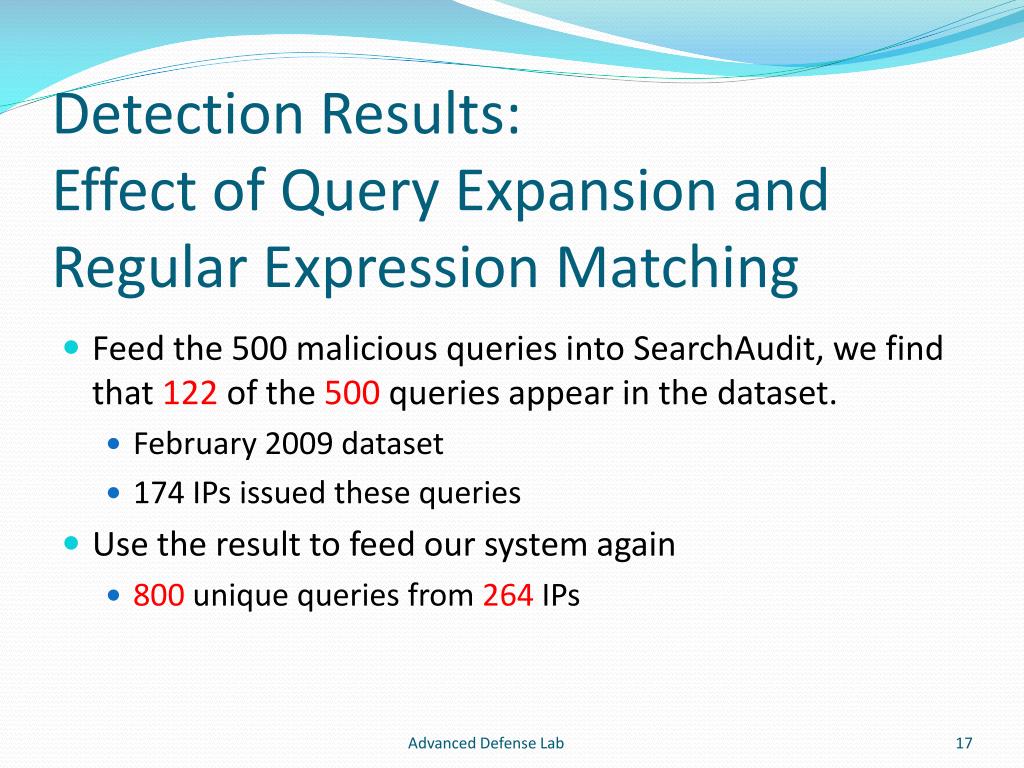 Detection Results:Effect of Query Expansion and Regular Expression Matching • Feed the 500 malicious queries into SearchAudit, we find that 122 of the 500 queries appear in the dataset. • February 2009 dataset • 174 IPs issued these queries • Use the result to feed our system again • 800 unique queries from 264 IPs Advanced Defense Lab