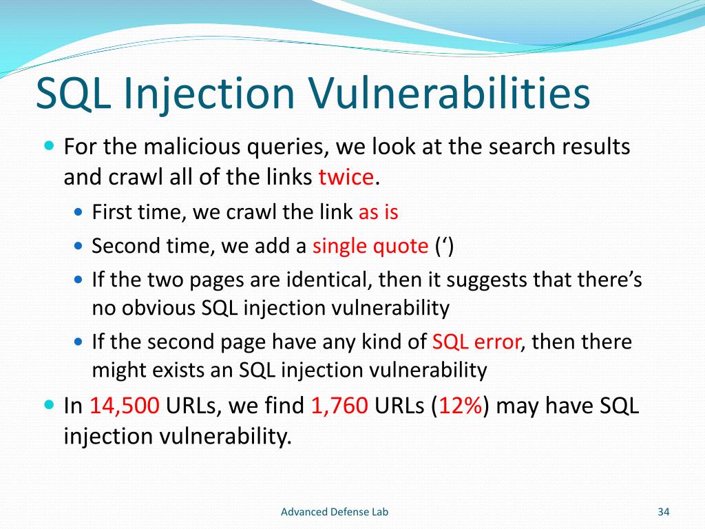 SQL Injection Vulnerabilities • For the malicious queries, we look at the search results and crawl all of the links twice. • First time, we crawl the link as is • Second time, we add a single quote (‘) • If the two pages are identical, then it suggests that there’s no obvious SQL injection vulnerability • If the second page have any kind of SQL error, then there might exists an SQL injection vulnerability • In 14,500 URLs, we find 1,760 URLs (12%) may have SQL injection vulnerability. Advanced Defense Lab