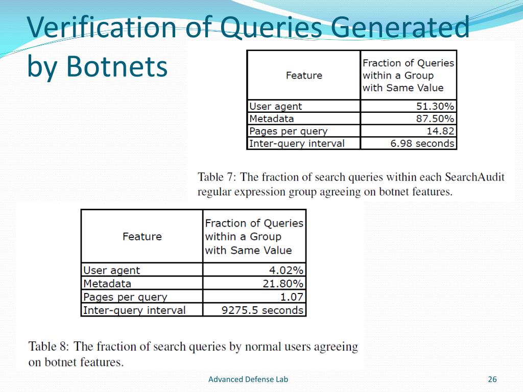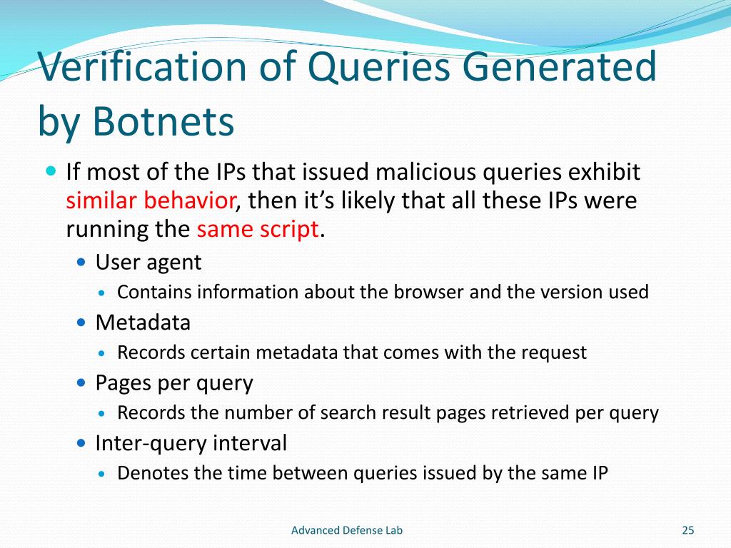 Verification of Queries Generated by Botnets • If most of the IPs that issued malicious queries exhibit similar behavior, then it’s likely that all these IPs were running the same script. • User agent • Contains information about the browser and the version used • Metadata • Records certain metadata that comes with the request • Pages per query • Records the number of search result pages retrieved per query • Inter-query interval • Denotes the time between queries issued by the same IP Advanced Defense Lab