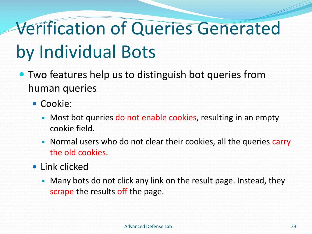 Verification of Queries Generated by Individual Bots • Two features help us to distinguish bot queries from human queries • Cookie: • Most bot queries do not enable cookies, resulting in an empty cookie field. • Normal users who do not clear their cookies, all the queries carry the old cookies. • Link clicked • Many bots do not click any link on the result page. Instead, they scrape the results off the page. Advanced Defense Lab