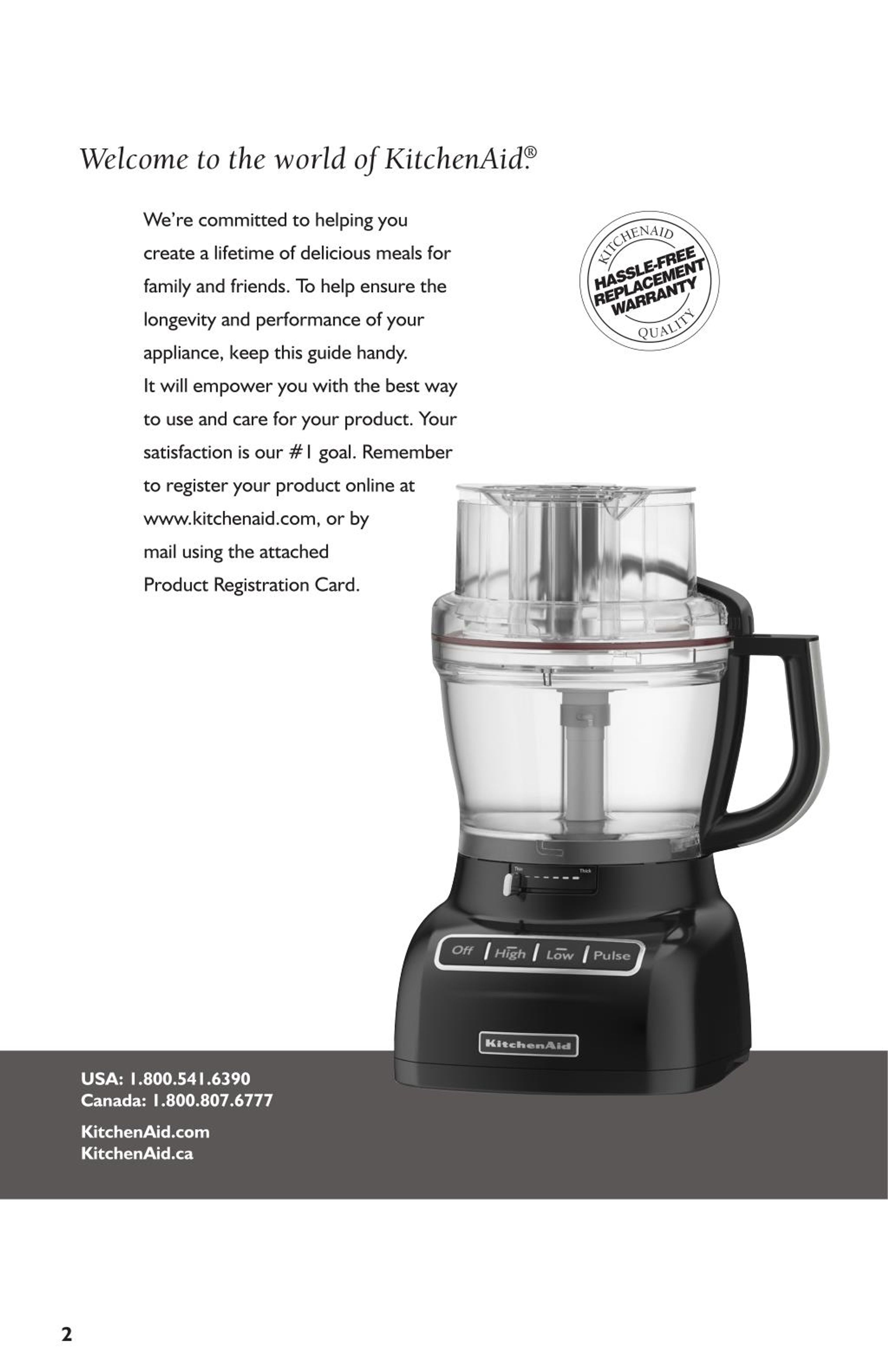 Welcome to the world of KitchenAid®. We’re committed to helping you create a lifetime of delicious meals for family and friends. To help ensure the longevity and performance of your appliance, keep this guide handy. It will empower you with the best way to use and care for your product. Your satisfaction is our #1 goal. Remember to register your product online at www.kitchenaid.com, or by mail using the attached Product Registration Card. USA: 1.800.541.6390 Canada: 1.800.807.6777 KitchenAid.com KitchenAid.ca 2 W10407578A_ENv2_bk.indd 2 7/1/11 5:44 PM