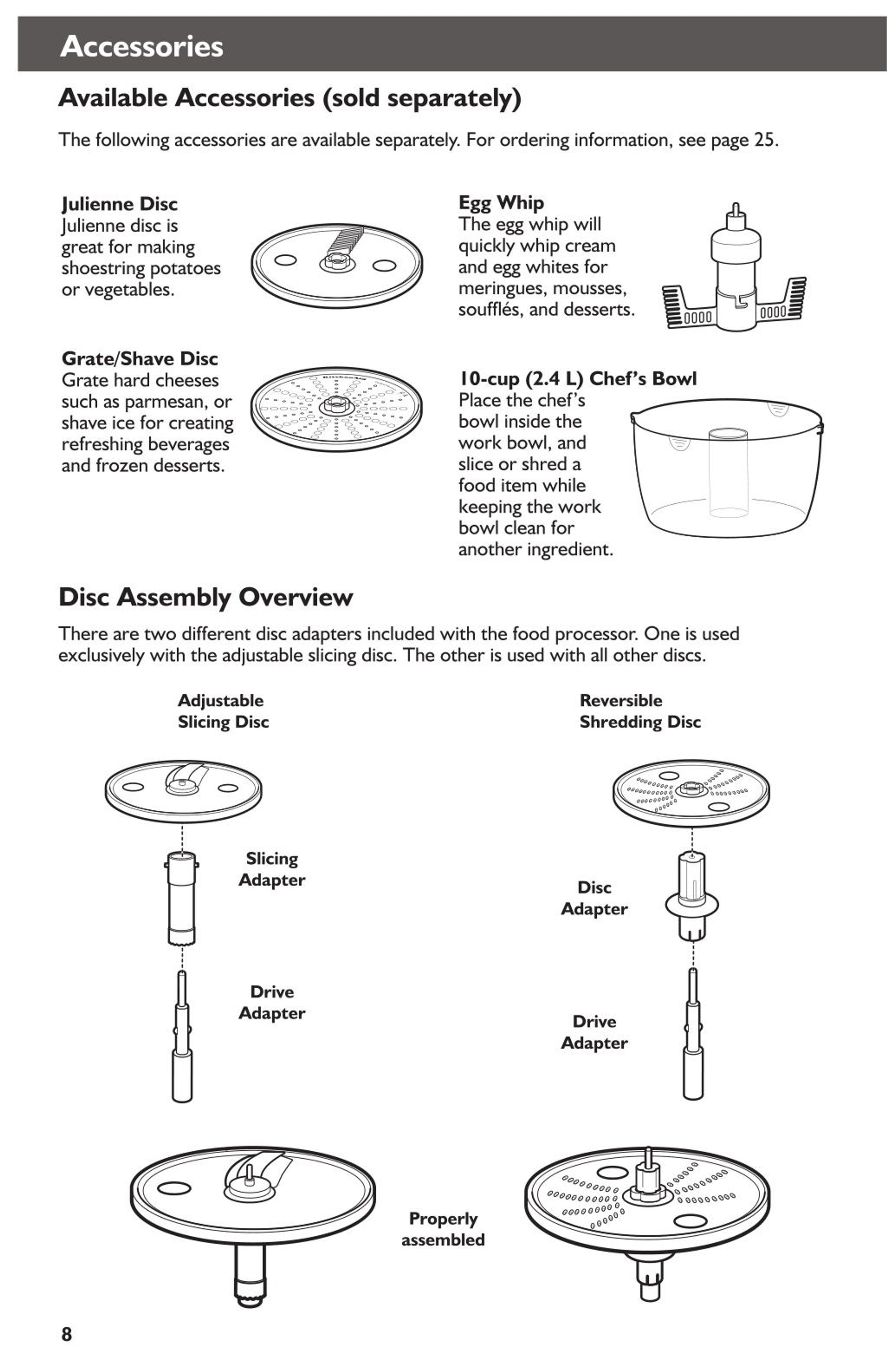 Accessories Available Accessories (sold separately) The following accessories are available separately. For ordering information, see page 25. Egg Whip The egg whip will quickly whip cream and egg whites for meringues, mousses, soufflés, and desserts. Julienne Disc Julienne disc is great for making shoestring potatoes or vegetables. Grate/Shave Disc Grate hard cheeses such as parmesan, or shave ice for creating refreshing beverages and frozen desserts. 10-cup (2.4 L) Chef’s Bowl Place the chef’s bowl inside the work bowl, and slice or shred a food item while keeping the work bowl clean for another ingredient. Grate/Shave Disc Assembly Overview There are two different disc adapters included with the food processor. One is used exclusively with the adjustable slicing disc. The other is used with all other discs. Adjustable Slicing Disc Reversible Shredding Disc Slicing Adapter Disc Adapter Drive Adapter Drive Adapter Properly assembled 8 W10407578A_ENv2_bk.indd 8 7/1/11 5:45 PM