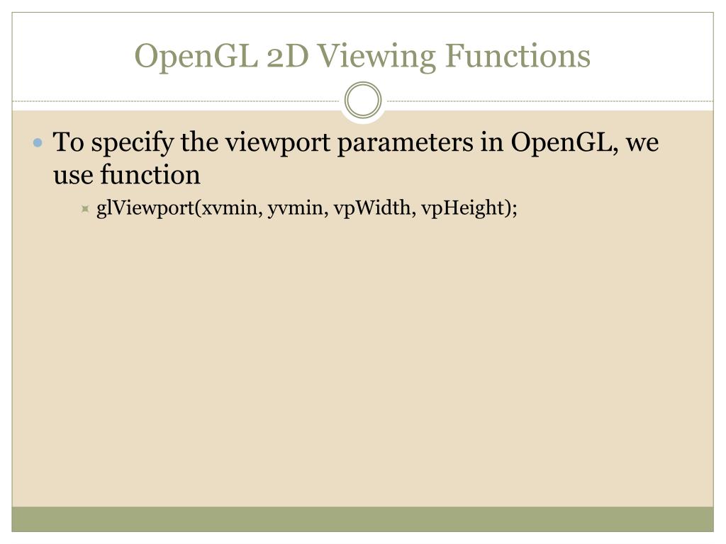 OpenGL 2D Viewing Functions • To specify the viewport parameters in OpenGL, we use function • glViewport(xvmin, yvmin, vpWidth, vpHeight);