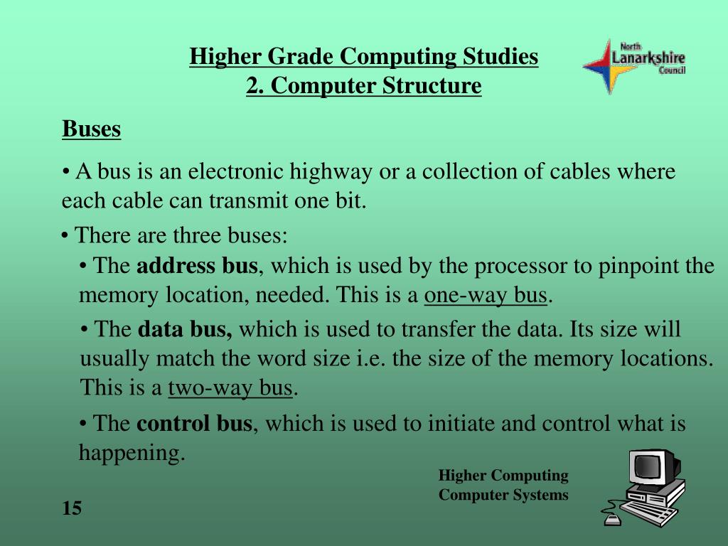 Higher Grade Computing Studies2. Computer Structure Buses • A bus is an electronic highway or a collection of cables where each cable can transmit one bit. • There are three buses: • The address bus, which is used by the processor to pinpoint the memory location, needed. This is a one-way bus. • The data bus, which is used to transfer the data. Its size will usually match the word size i.e. the size of the memory locations. This is a two-way bus. • The control bus, which is used to initiate and control what is happening.