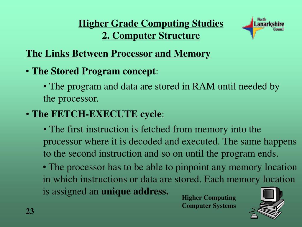 Higher Grade Computing Studies2. Computer Structure The Links Between Processor and Memory • The Stored Program concept: • The program and data are stored in RAM until needed by the processor. • The FETCH-EXECUTE cycle: • The first instruction is fetched from memory into the processor where it is decoded and executed. The same happens to the second instruction and so on until the program ends. • The processor has to be able to pinpoint any memory location in which instructions or data are stored. Each memory location is assigned an unique address.