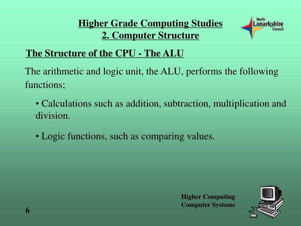 Higher Grade Computing Studies2. Computer Structure The Structure of the CPU - The ALU The arithmetic and logic unit, the ALU, performs the following functions; • Calculations such as addition, subtraction, multiplication and division. • Logic functions, such as comparing values.