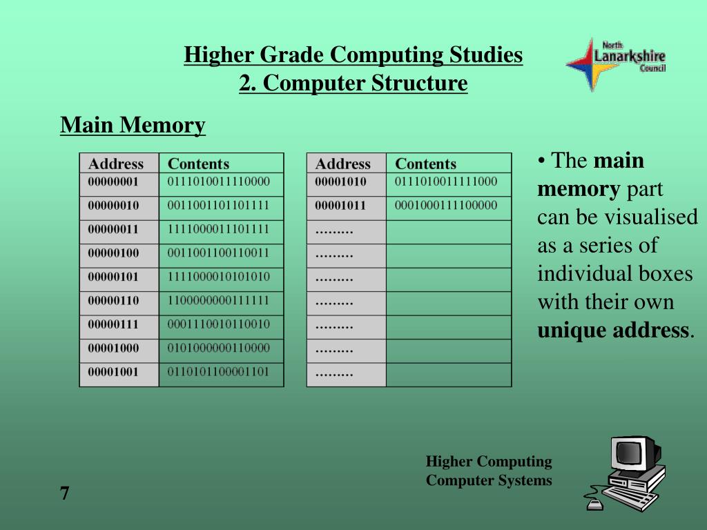 Higher Grade Computing Studies2. Computer Structure Main Memory • The main memory part can be visualised as a series of individual boxes with their own unique address.