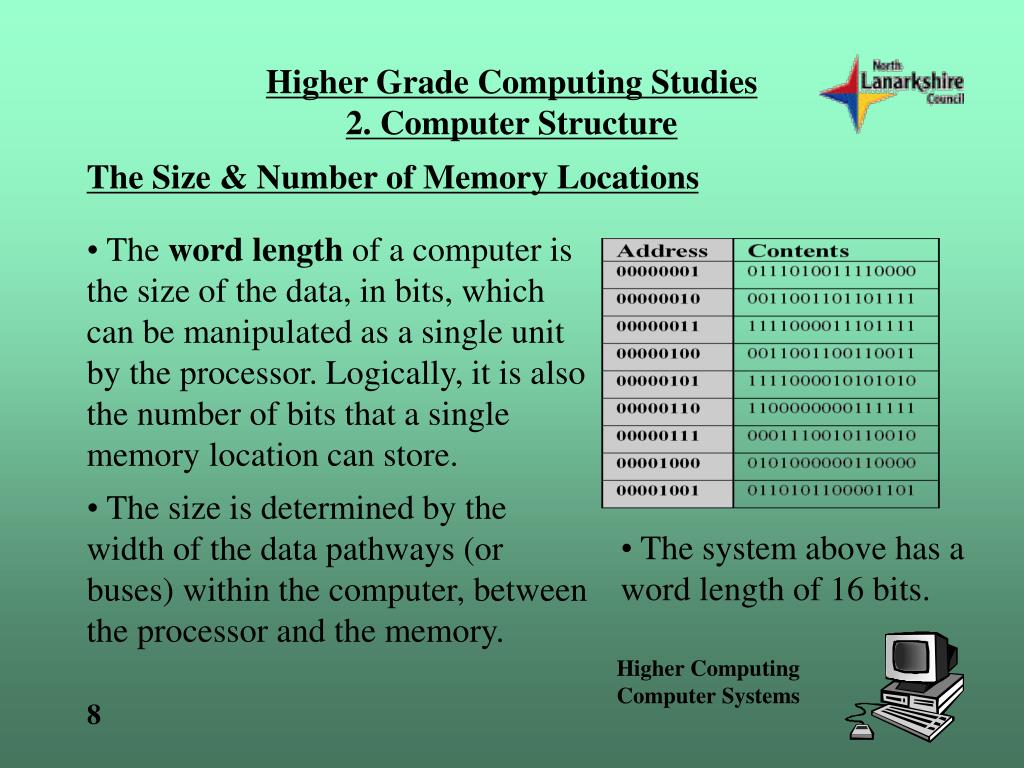 Higher Grade Computing Studies2. Computer Structure The Size & Number of Memory Locations • The word length of a computer is the size of the data, in bits, which can be manipulated as a single unit by the processor. Logically, it is also the number of bits that a single memory location can store. • The size is determined by the width of the data pathways (or buses) within the computer, between the processor and the memory. • The system above has a word length of 16 bits.
