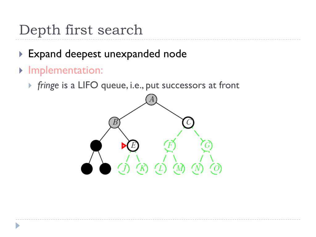 Depth first search • Expand deepest unexpanded node • Implementation: • fringe is a LIFO queue, i.e., put successors at front