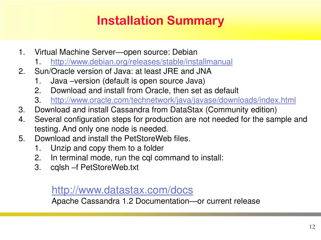 Installation Summary • Virtual Machine Server—open source: Debian • http://www.debian.org/releases/stable/installmanual • Sun/Oracle version of Java: at least JRE and JNA • Java –version (default is open source Java) • Download and install from Oracle, then set as default • http://www.oracle.com/technetwork/java/javase/downloads/index.html • Download and install Cassandra from DataStax (Community edition) • Several configuration steps for production are not needed for the sample and testing. And only one node is needed. • Download and install the PetStoreWeb files. • Unzip and copy them to a folder • In terminal mode, run the cql command to install: • cqlsh –f PetStoreWeb.txt http://www.datastax.com/docs Apache Cassandra 1.2 Documentation—or current release