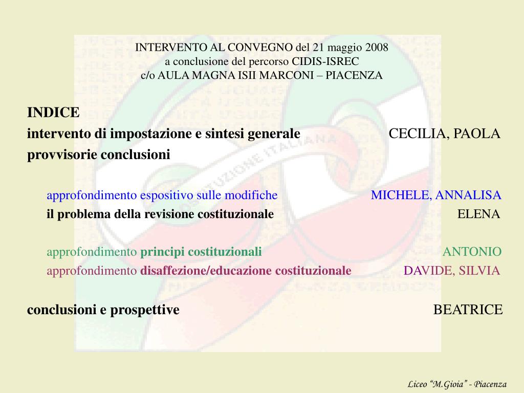 INTERVENTO AL CONVEGNO del 21 maggio 2008a conclusione del percorso CIDIS-ISRECc/o AULA MAGNA ISII MARCONI – PIACENZA INDICE intervento di impostazione e sintesi generale CECILIA, PAOLA provvisorie conclusioni approfondimento espositivo sulle modifiche MICHELE, ANNALISA il problema della revisione costituzionale ELENA approfondimento principi costituzionali ANTONIO approfondimento disaffezione/educazione costituzionaleDAVIDE, SILVIA conclusioni e prospettive BEATRICE Liceo “M.Gioia” - Piacenza