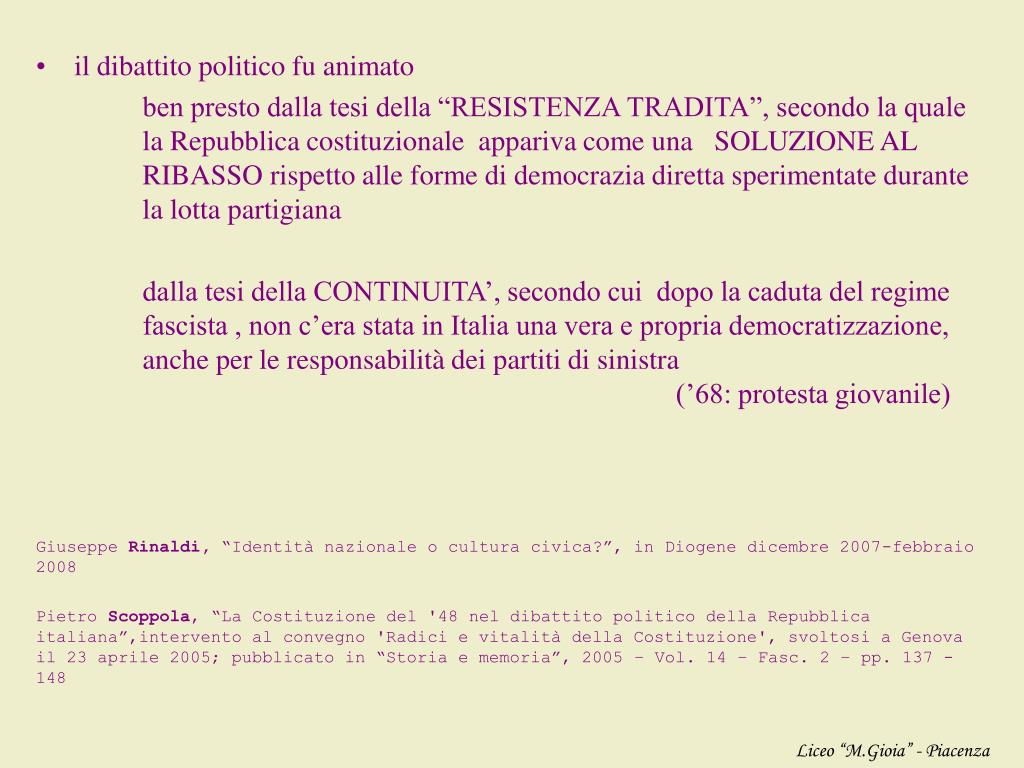 il dibattito politico fu animato ben presto dalla tesi della “RESISTENZA TRADITA”, secondo la quale la Repubblica costituzionale appariva come una SOLUZIONE AL RIBASSO rispetto alle forme di democrazia diretta sperimentate durante la lotta partigiana dalla tesi della CONTINUITA’, secondo cui dopo la caduta del regime fascista , non c’era stata in Italia una vera e propria democratizzazione, anche per le responsabilità dei partiti di sinistra (’68: protesta giovanile) Giuseppe Rinaldi, “Identità nazionale o cultura civica?”, in Diogene dicembre 2007-febbraio 2008 Pietro Scoppola, “La Costituzione del '48 nel dibattito politico della Repubblica italiana”,intervento al convegno 'Radici e vitalità della Costituzione', svoltosi a Genova il 23 aprile 2005; pubblicato in “Storia e memoria”, 2005 – Vol. 14 – Fasc. 2 – pp. 137 - 148 Liceo “M.Gioia” - Piacenza
