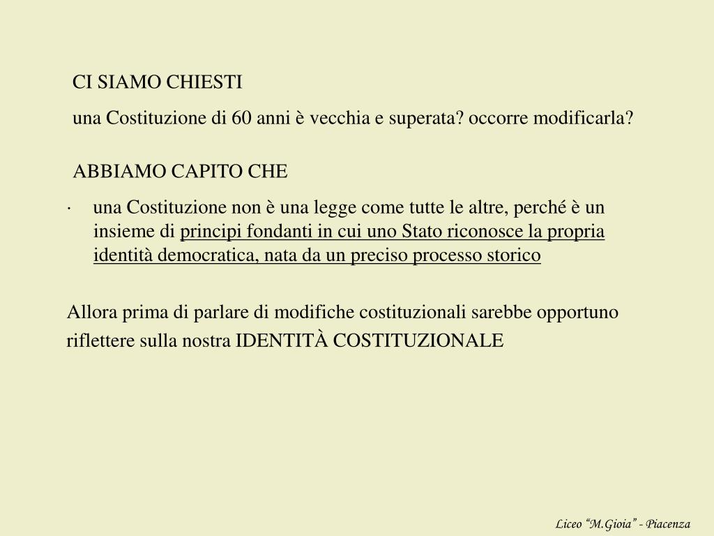 CI SIAMO CHIESTI una Costituzione di 60 anni è vecchia e superata? occorre modificarla? · una Costituzione non è una legge come tutte le altre, perché è un insieme di principi fondanti in cui uno Stato riconosce la propria identità democratica, nata da un preciso processo storico Allora prima di parlare di modifiche costituzionali sarebbe opportuno riflettere sulla nostra IDENTITÀ COSTITUZIONALE ABBIAMO CAPITO CHE Liceo “M.Gioia” - Piacenza
