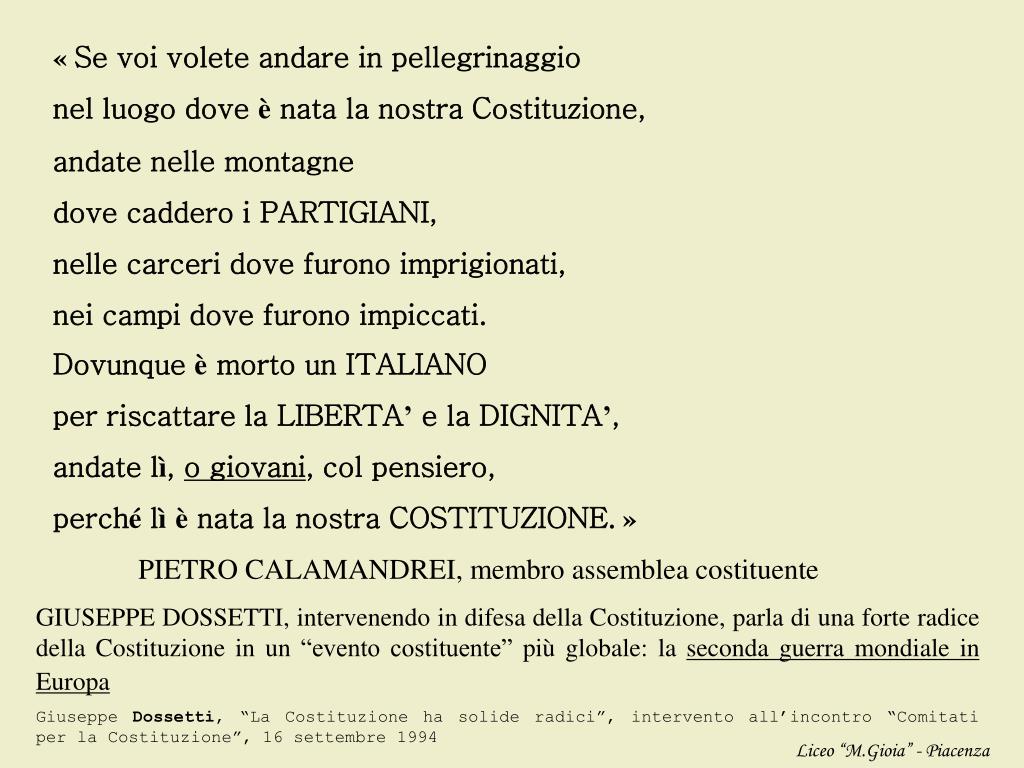 « Se voi volete andare in pellegrinaggio nel luogo dove è nata la nostra Costituzione, andate nelle montagne dove caddero i PARTIGIANI, nelle carceri dove furono imprigionati, nei campi dove furono impiccati. Dovunque è morto un ITALIANO per riscattare la LIBERTA’ e la DIGNITA’, andate lì, o giovani, col pensiero, perché lìè nata la nostra COSTITUZIONE. » PIETRO CALAMANDREI, membro assemblea costituente GIUSEPPE DOSSETTI, intervenendo in difesa della Costituzione, parla di una forte radice della Costituzione in un “evento costituente” più globale: la seconda guerra mondiale in Europa Giuseppe Dossetti, “La Costituzione ha solide radici”, intervento all’incontro “Comitati per la Costituzione”, 16 settembre 1994 Liceo “M.Gioia” - Piacenza