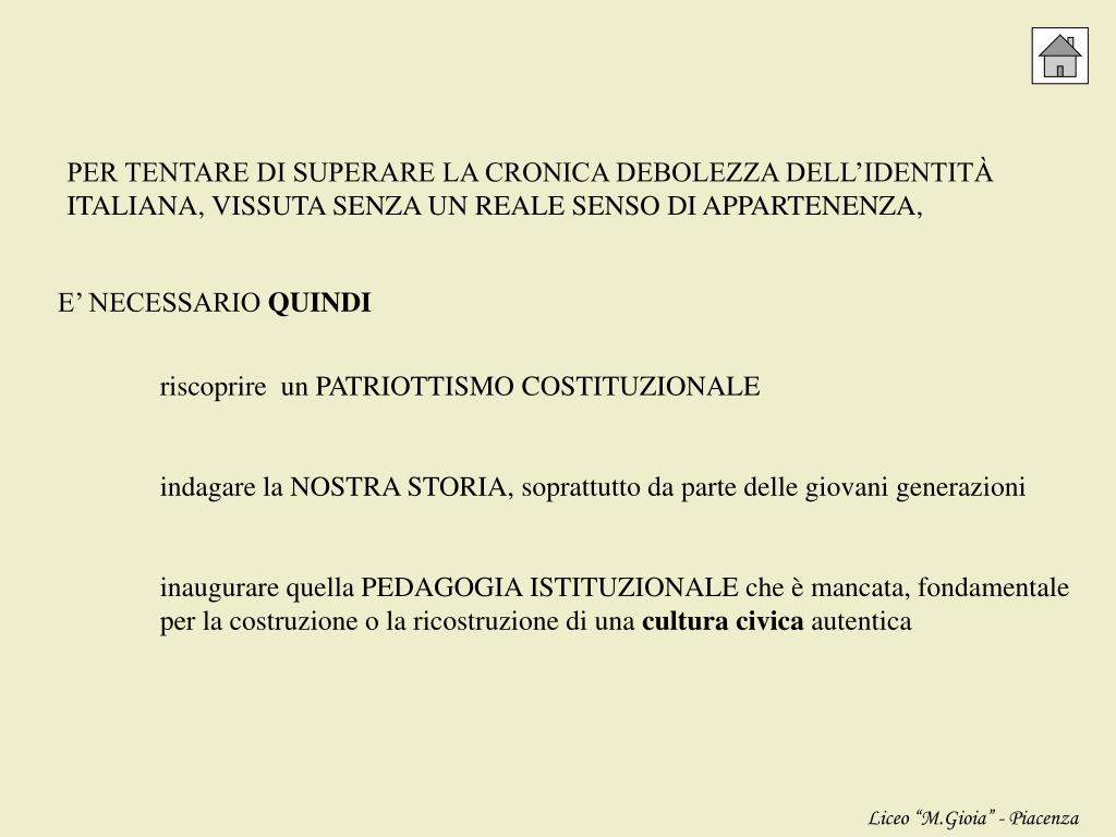 PER TENTARE DI SUPERARE LA CRONICA DEBOLEZZA DELL’IDENTITÀ ITALIANA, VISSUTA SENZA UN REALE SENSO DI APPARTENENZA, E’ NECESSARIO QUINDI riscoprire un PATRIOTTISMO COSTITUZIONALE indagare la NOSTRA STORIA, soprattutto da parte delle giovani generazioni inaugurare quella PEDAGOGIA ISTITUZIONALE che è mancata, fondamentale per la costruzione o la ricostruzione di una cultura civica autentica Liceo “M.Gioia” - Piacenza