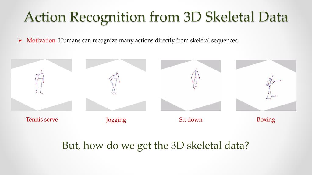 Action Recognition from 3D Skeletal Data • Motivation: Humans can recognize many actions directly from skeletal sequences. Tennis serve Boxing Sit down Jogging But, how do we get the 3D skeletal data?