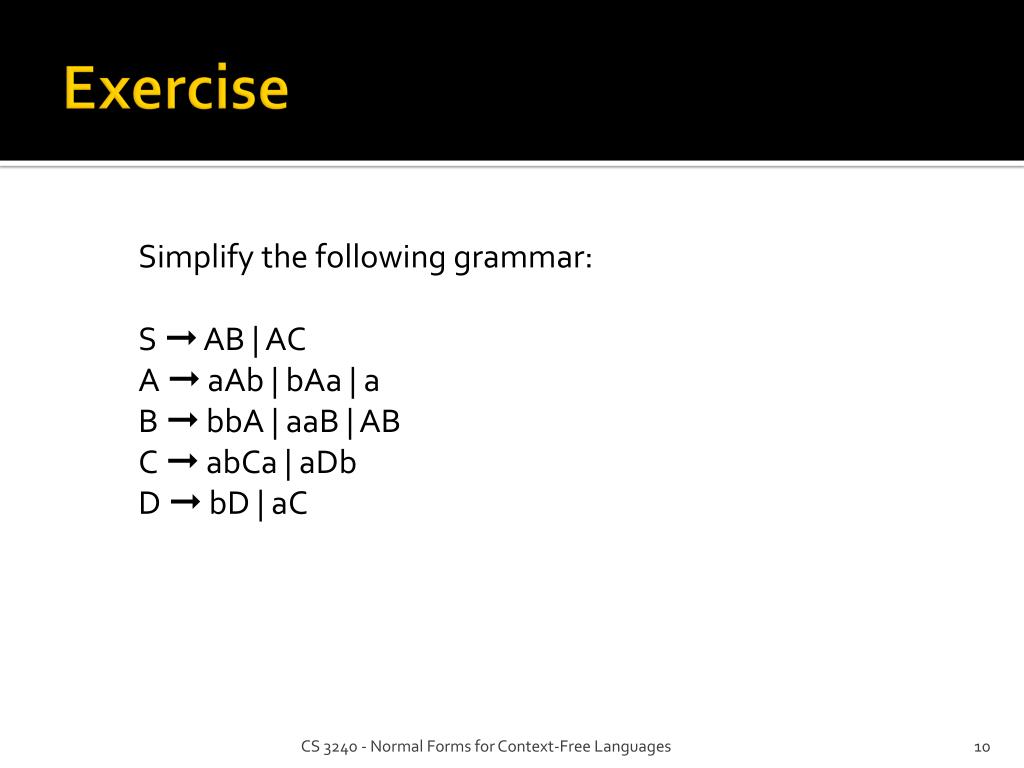 Exercise Simplify the following grammar: S ➞ AB | AC A ➞ aAb | bAa | a B ➞ bbA | aaB | AB C ➞ abCa | aDb D ➞ bD | aC CS 3240 - Normal Forms for Context-Free Languages