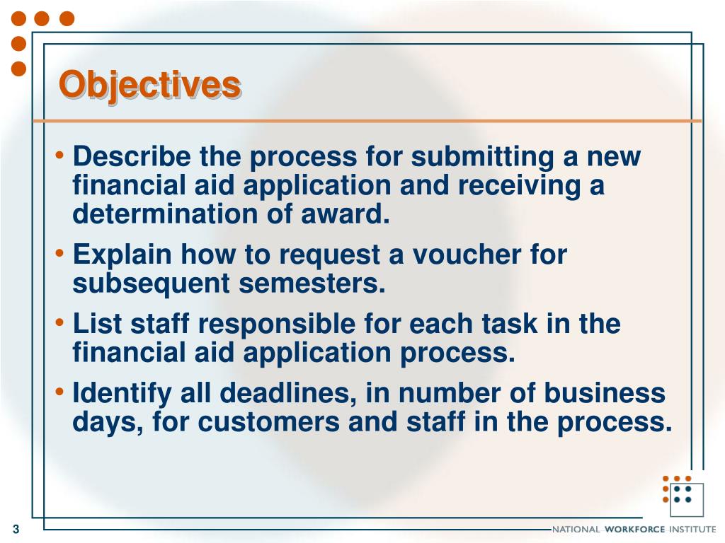 Objectives • Describe the process for submitting a new financial aid application and receiving a determination of award. • Explain how to request a voucher for subsequent semesters. • List staff responsible for each task in the financial aid application process. • Identify all deadlines, in number of business days, for customers and staff in the process.