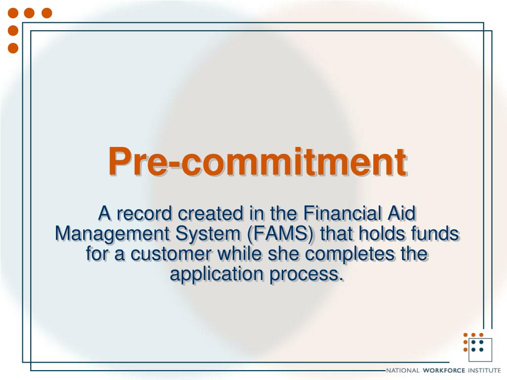 Pre-commitment A record created in the Financial Aid Management System (FAMS) that holds funds for a customer while she completes the application process.