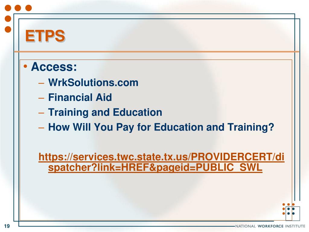 ETPS • Access: • WrkSolutions.com • Financial Aid • Training and Education • How Will You Pay for Education and Training? https://services.twc.state.tx.us/PROVIDERCERT/dispatcher?link=HREF&pageid=PUBLIC_SWL