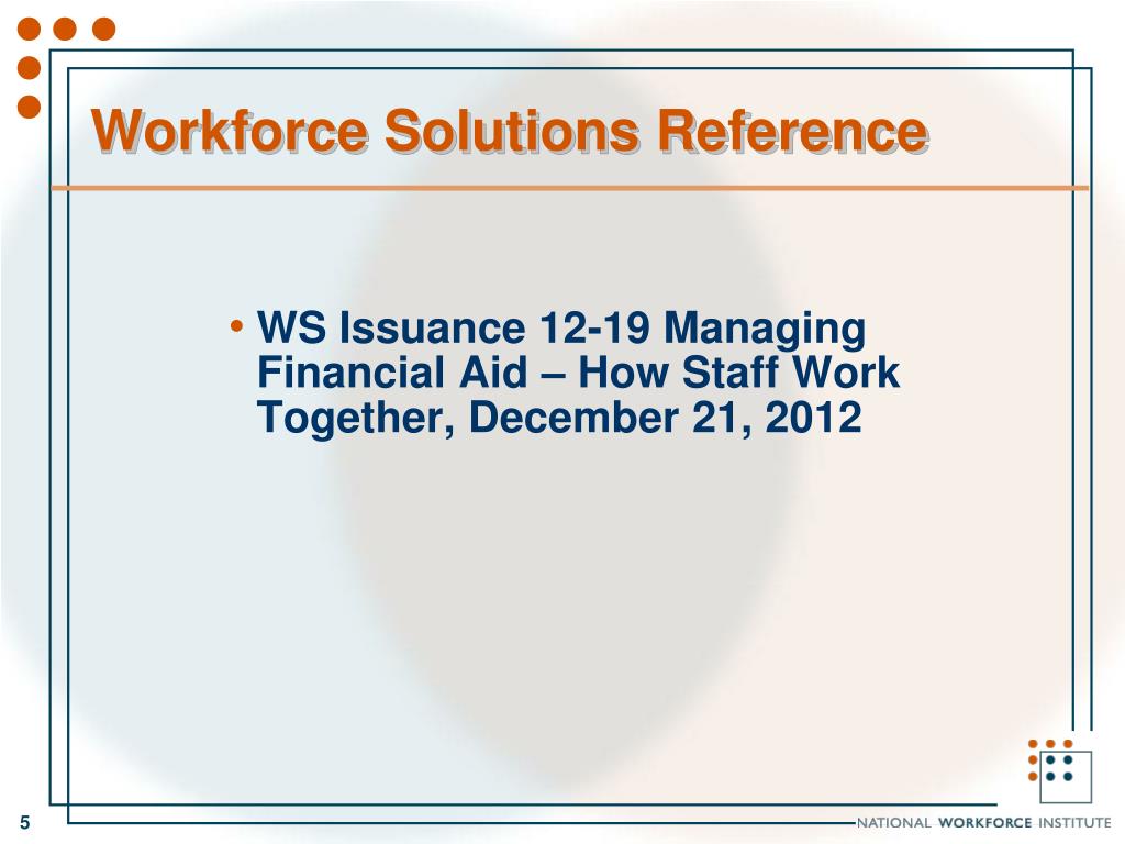 Workforce Solutions Reference • WS Issuance 12-19 Managing Financial Aid – How Staff Work Together, December 21, 2012