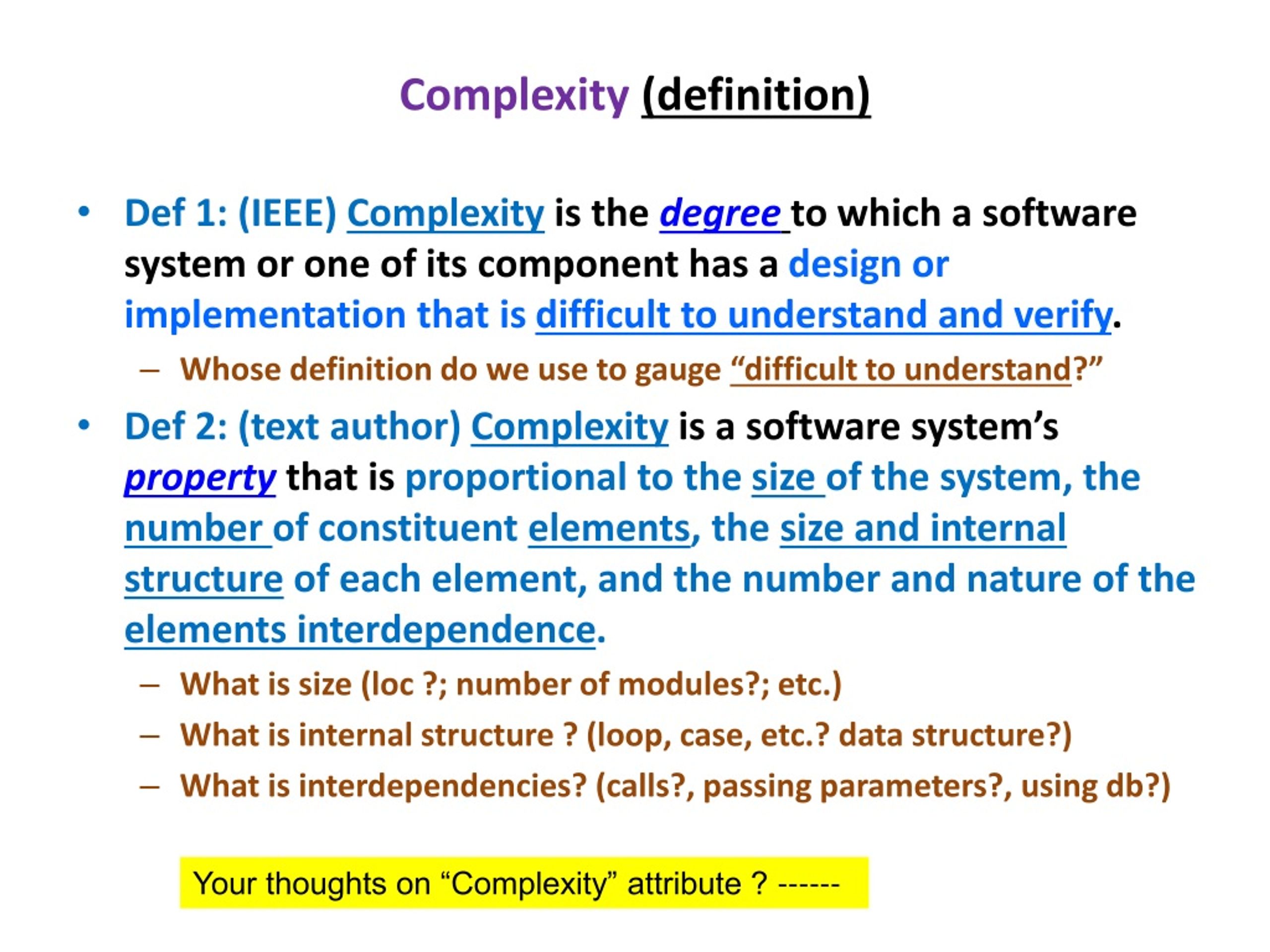 Complexity(definition) • Def 1: (IEEE) Complexityis thedegreeto which a software system or one of its component has a design or implementation that is difficult to understand and verify. • Whose definition do we use to gauge “difficult to understand?” • Def 2: (text author) Complexity is a software system’s property that is proportional to the size of the system, the number of constituent elements, the size and internal structure of each element, and the number and nature of the elements interdependence. • What is size (loc ?; number of modules?; etc.) • What is internal structure ? (loop, case, etc.? data structure?) • What is interdependencies? (calls?, passing parameters?, using db?) Your thoughts on “Complexity” attribute ? ------