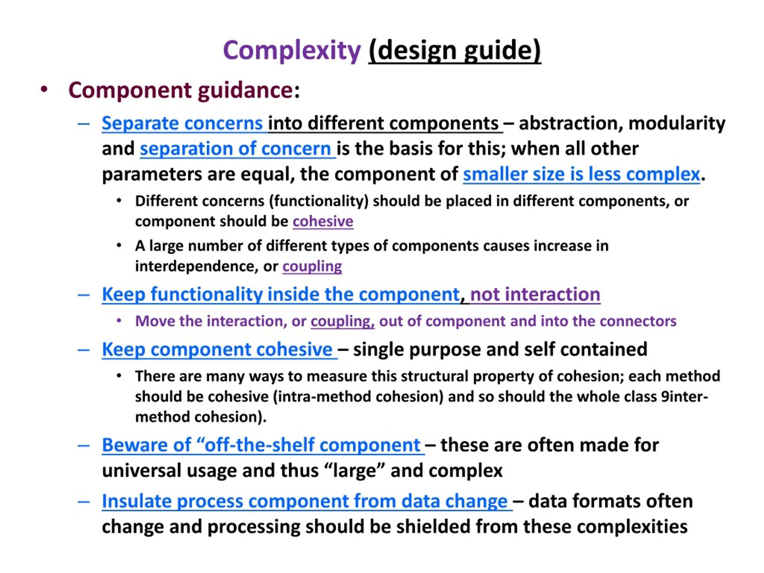 Complexity(design guidance) • Connectors guidance: • Treat connectors explicitly – application-dependent interaction and data should be separated from application-independent interactions; application independent interactions are candidates to be placed into the connectors • Keep only application-independent interaction facilities inside the connectors • Separate interaction concerns (functionalities) into different connectors – there may be different connector concerns, in which case separate those concerns into different connectors (e.g. transmission connector and data compaction connectors should be separated out as opposed to merged into one --- cohesion of connector) • Restrict interactions facilitated by each connector – ensure that unnecessary components are not brought into the interaction by the connector • Beware of off-the-shelf connectors – same concern as off-the-shelf component