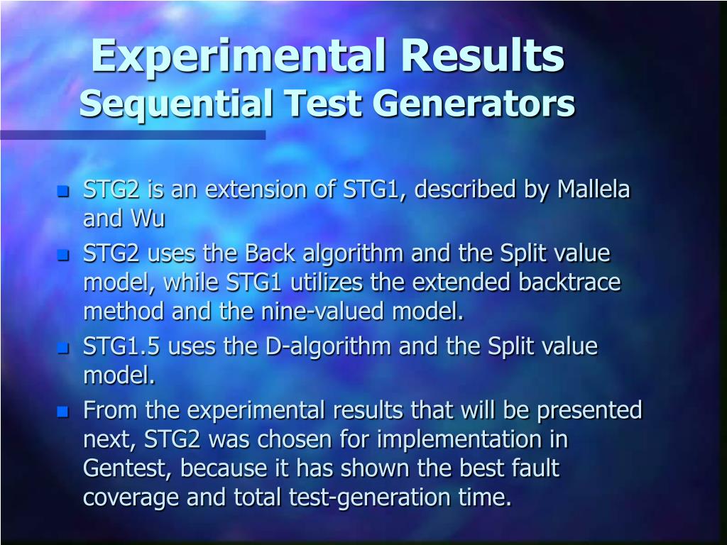 Experimental ResultsSequential Test Generators • STG2 is an extension of STG1, described by Mallela and Wu • STG2 uses the Back algorithm and the Split value model, while STG1 utilizes the extended backtrace method and the nine-valued model. • STG1.5 uses the D-algorithm and the Split value model. • From the experimental results that will be presented next, STG2 was chosen for implementation in Gentest, because it has shown the best fault coverage and total test-generation time.