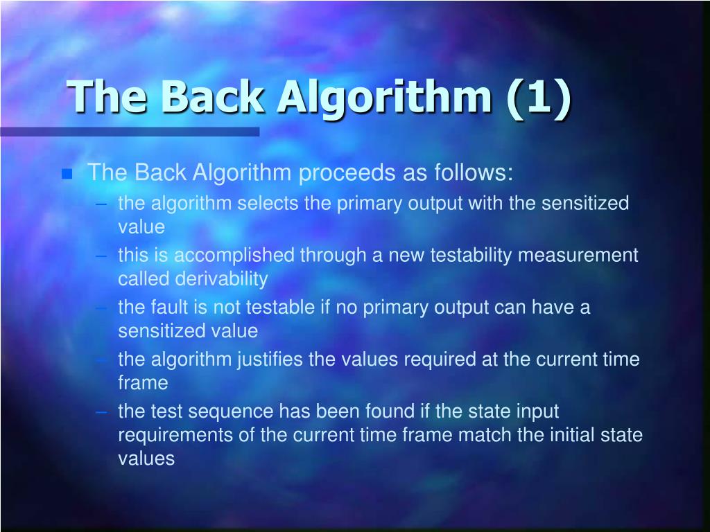 The Back Algorithm (1) • The Back Algorithm proceeds as follows: • the algorithm selects the primary output with the sensitized value • this is accomplished through a new testability measurement called derivability • the fault is not testable if no primary output can have a sensitized value • the algorithm justifies the values required at the current time frame • the test sequence has been found if the state input requirements of the current time frame match the initial state values
