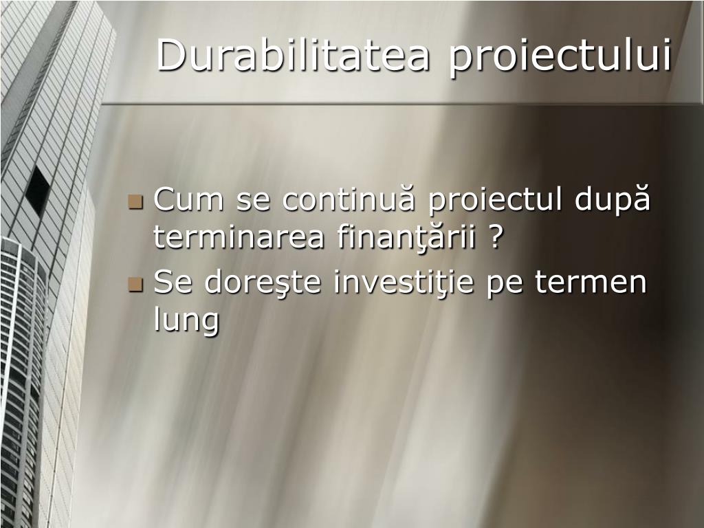 Durabilitatea proiectului • Cum se continuă proiectul după terminarea finanţării ? • Se doreşte investiţie pe termen lung
