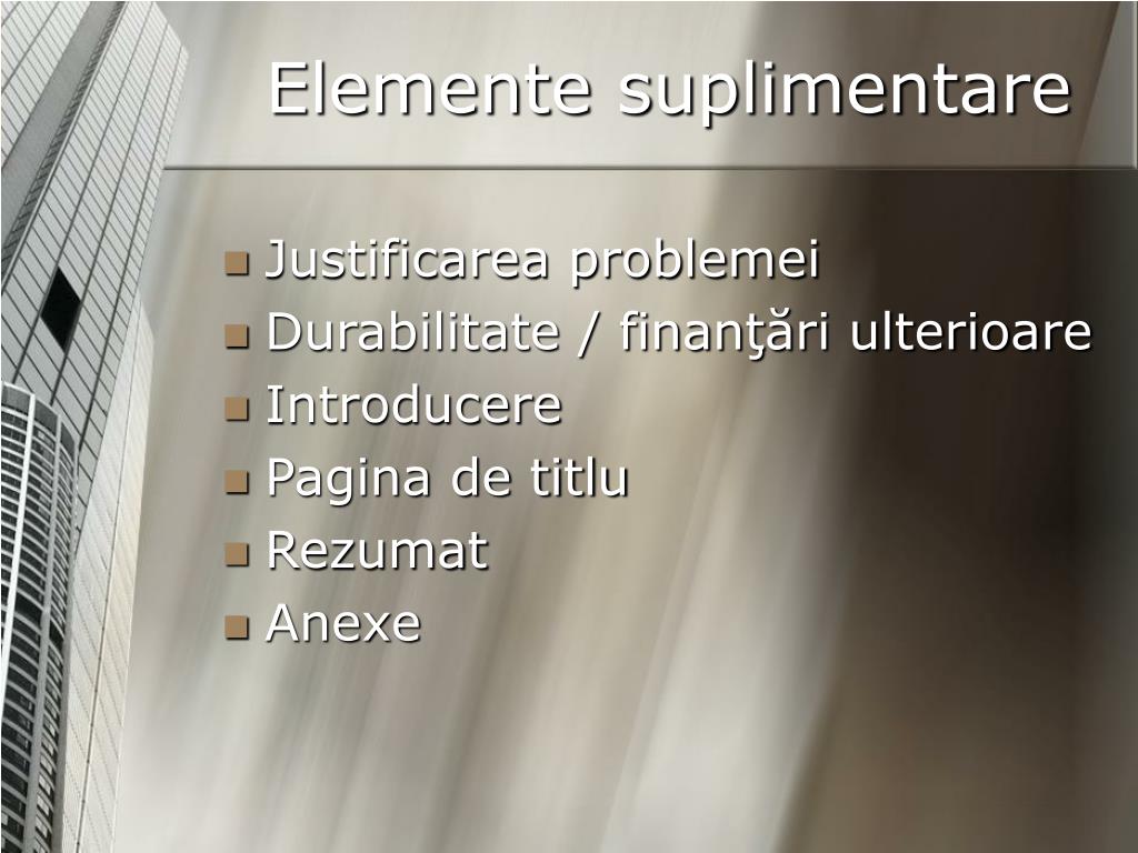 Elemente suplimentare • Justificarea problemei • Durabilitate / finanţări ulterioare • Introducere • Pagina de titlu • Rezumat • Anexe