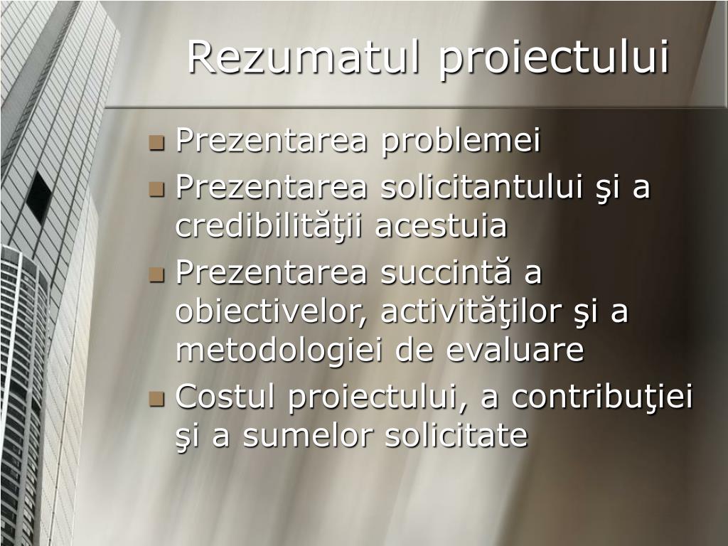 Rezumatul proiectului • Prezentarea problemei • Prezentarea solicitantului şi a credibilităţii acestuia • Prezentarea succintă a obiectivelor, activităţilor şi a metodologiei de evaluare • Costul proiectului, a contribuţiei şi a sumelor solicitate