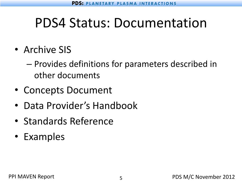 PDS4 Status: Documentation • Archive SIS • Provides definitions for parameters described in other documents • Concepts Document • Data Provider’s Handbook • Standards Reference • Examples