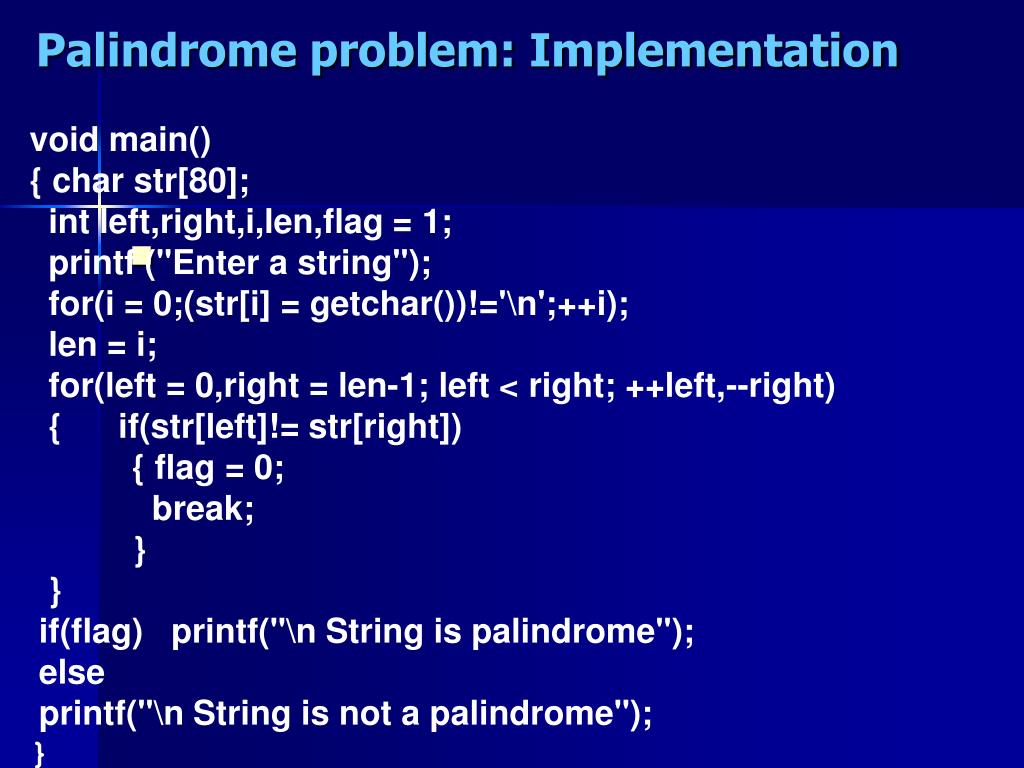 Palindrome problem: Implementation void main() { char str[80]; int left,right,i,len,flag = 1; printf ("Enter a string"); for(i = 0;(str[i] = getchar())!='\n';++i); len = i; for(left = 0,right = len-1; left < right; ++left,--right) { if(str[left]!= str[right]) { flag = 0; break; } } if(flag) printf("\n String is palindrome"); else printf("\n String is not a palindrome"); }