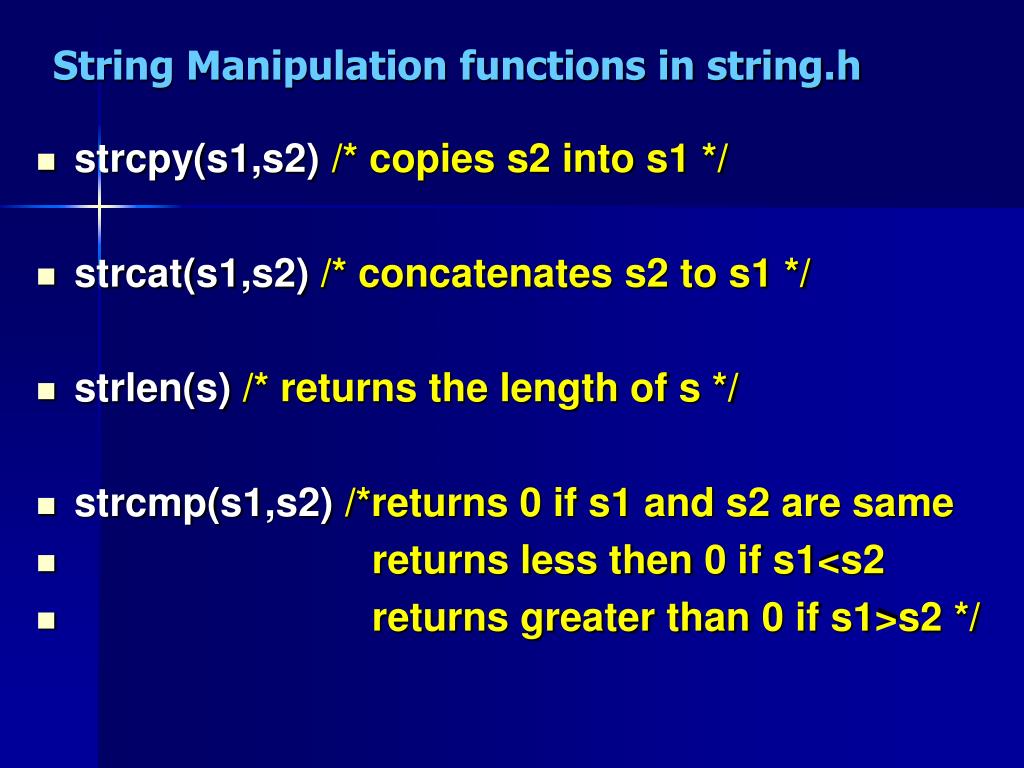 String Manipulation functions in string.h • strcpy(s1,s2) /* copies s2 into s1 */ • strcat(s1,s2) /* concatenates s2 to s1 */ • strlen(s) /* returns the length of s */ • strcmp(s1,s2)/*returns 0 if s1 and s2 are same • returns less then 0 if s1<s2 • returns greater than 0 if s1>s2 */