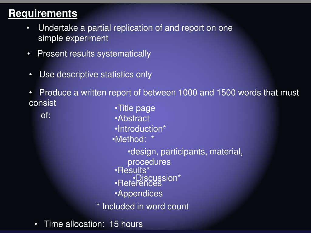 Internal Assessment. Requirements. Present results systematically. Undertake a partial replication of and report on one simple experiment. Use descriptive statistics only. Produce a written report of between 1000 and 1500 words that must consist of:. Title page. Abstract.