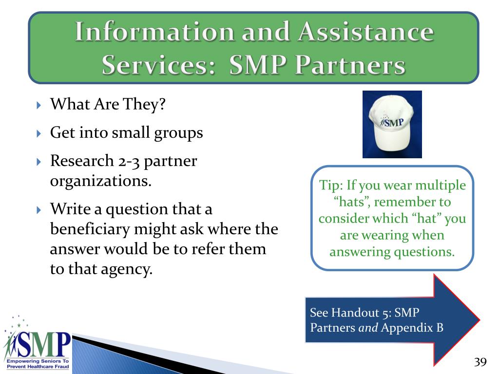 Information and Assistance Services: SMP Partners • What Are They? • Get into small groups • Research 2-3 partner organizations. • Write a question that a beneficiary might ask where the answer would be to refer them to that agency. Tip: If you wear multiple “hats”, remember to consider which “hat” you are wearing when answering questions. See Handout 5: SMP Partners and Appendix B