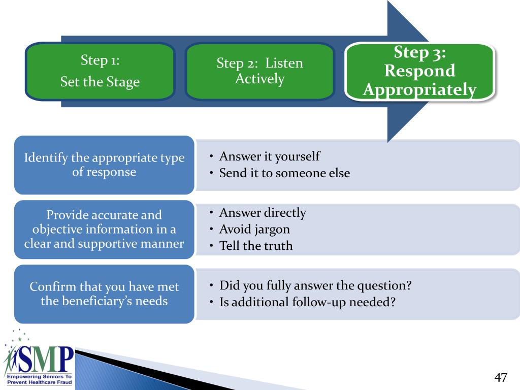 Invite the beneficiary to explain their question or issue • “What can I help you with today?” • Focus on the beneficiary • Stop. Listen. You can’t hear if you do all of the talking. • Be patient. Give your undivided attention. • Take notes Step 1: Set the Stage Step 2: Listen Actively Step 3: Respond Appropriately