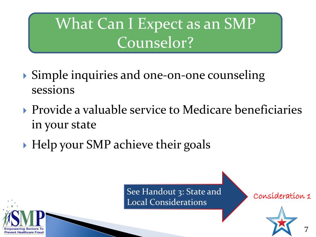 What Can I Expect as an SMP Counselor? • Simple inquiries and one-on-one counseling sessions • Provide a valuable service to Medicare beneficiaries in your state • Help your SMP achieve their goals See Handout 3: State and Local Considerations Consideration 1