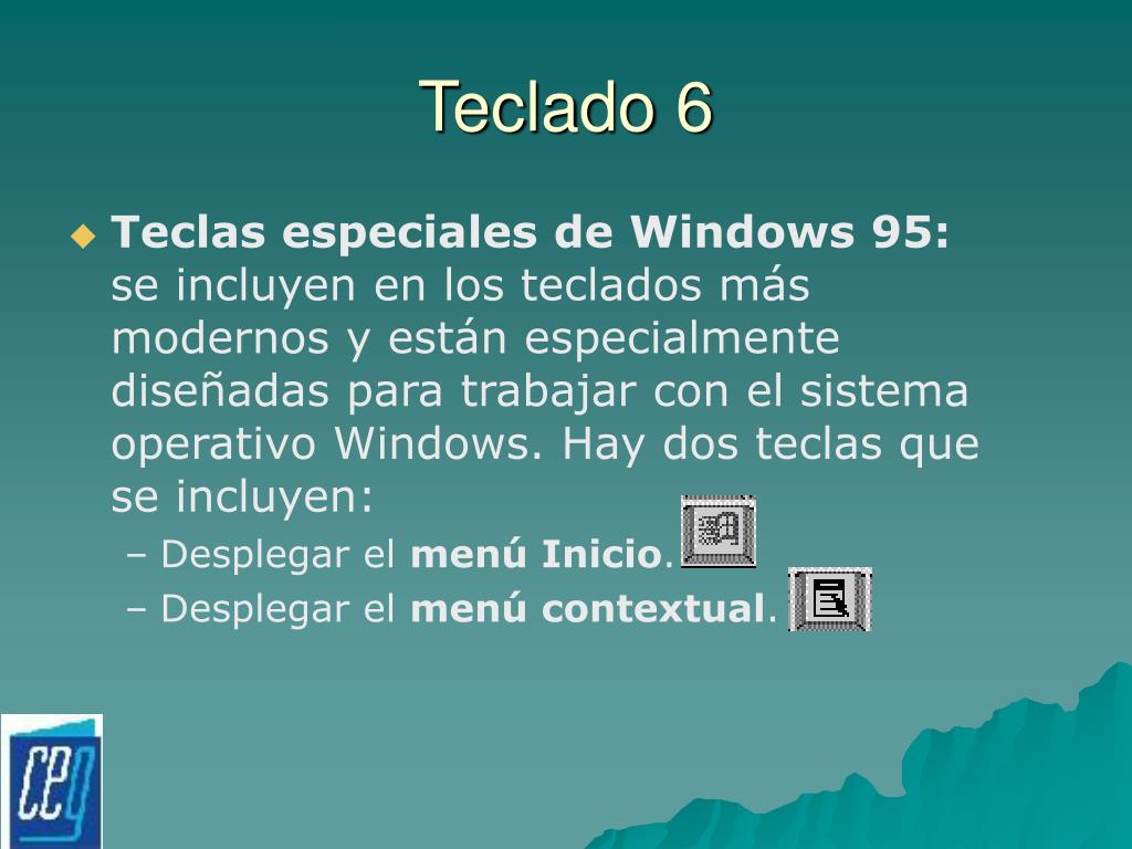 Teclado 6 • Teclas especiales de Windows 95: se incluyen en los teclados más modernos y están especialmente diseñadas para trabajar con el sistema operativo Windows. Hay dos teclas que se incluyen: • Desplegar el menú Inicio. • Desplegar el menú contextual.