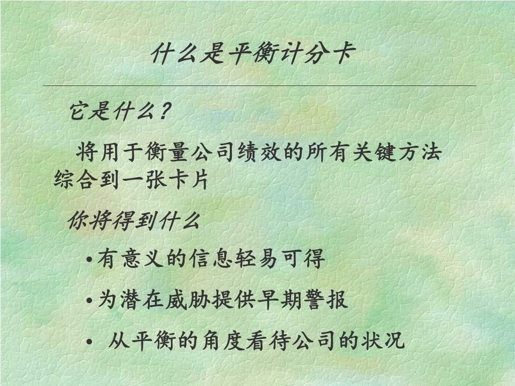 什么是平衡计分卡 它是什么? 将用于衡量公司绩效的所有关键方法 综合到一张卡片 你将得到什么 有意义的信息轻易可得 为潜在威胁提供早期警报 从平衡的角度看待公司的状况