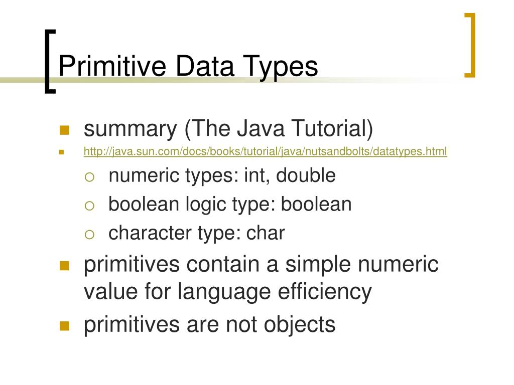 Primitive Data Types • summary (The Java Tutorial) • http://java.sun.com/docs/books/tutorial/java/nutsandbolts/datatypes.html • numeric types: int, double • boolean logic type: boolean • character type: char • primitives contain a simple numeric value for language efficiency • primitives are not objects