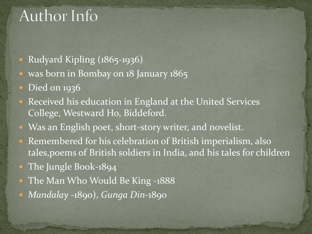 Author Info • Rudyard Kipling (1865-1936) • was born in Bombay on 18 January 1865 • Died on 1936 • Received his education in England at the United Services College, Westward Ho, Biddeford. • Was an English poet, short-story writer, and novelist. • Remembered for his celebration of British imperialism, also tales,poems of British soldiers in India, and his tales for children • The Jungle Book-1894 • The Man Who Would Be King -1888 • Mandalay -1890), Gunga Din-1890