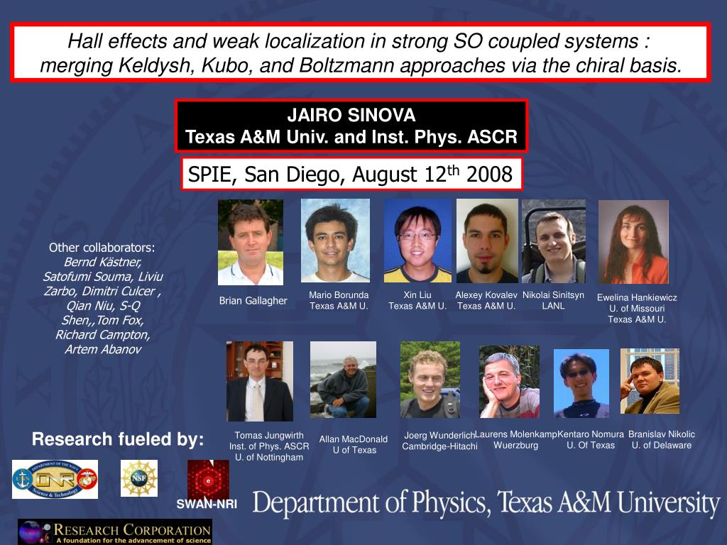 Hall effects and weak localization in strong SO coupled systems : merging Keldysh, Kubo, and Boltzmann approaches via the chiral basis. JAIRO SINOVA Texas A&M Univ. and Inst. Phys. ASCR. SPIE, San Diego, August 12 th 2008. Mario Borunda Texas A&M U. Xin Liu Texas A&M U. Alexey Kovalev