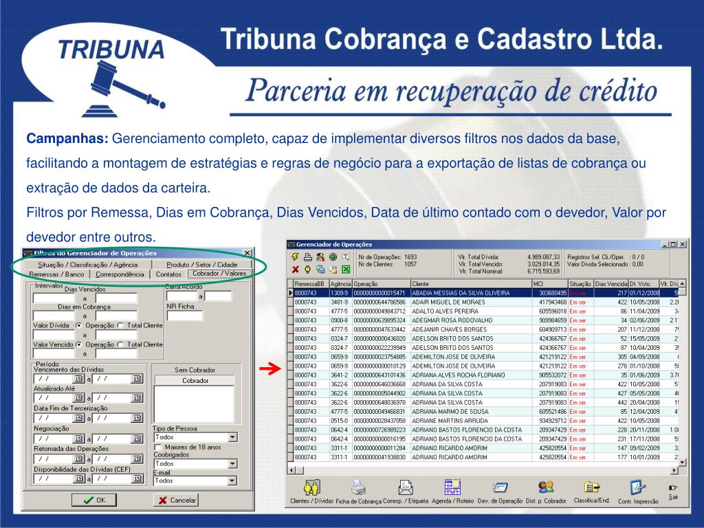 Campanhas: Gerenciamento completo, capaz de implementar diversos filtros nos dados da base, facilitando a montagem de estratégias e regras de negócio para a exportação de listas de cobrança ou extração de dados da carteira. Filtros por Remessa, Dias em Cobrança, Dias Vencidos, Data de último contado com o devedor, Valor por devedor entre outros.